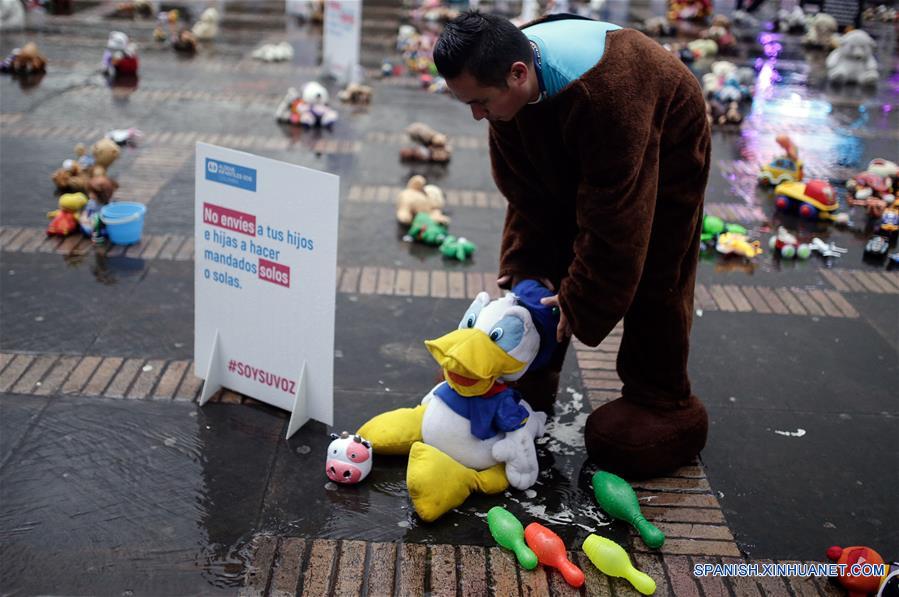 Una persona coloca juguetes durante el "Plantón de Juguetes", en la Plaza Bolívar, en Bogotá, capital de Colombia, el 20 de noviembre de 2017. De acuerdo con información de la prensa local, con alrededor de 500 juguetes, la organización Aldeas Infantiles SOS Colombia llevó a cabo el lunes el "Plantón de Juguetes" en contra del abuso sexual infantil, y para crear conciencia sobre la necesidad del involucramiento de la ciudadanía en la proteción de los ni?os. (Xinhua/Jhon Paz)