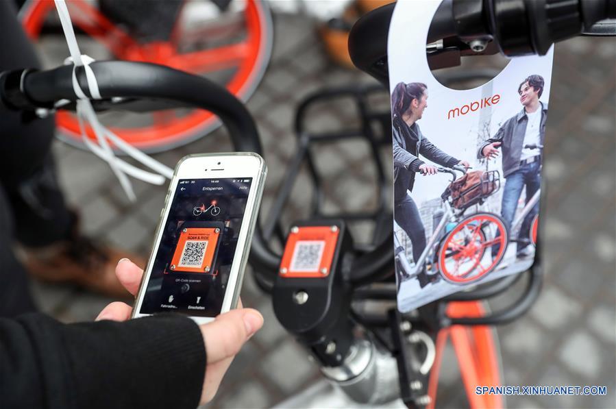BERLIN, noviembre 21, 2017 (Xinhua) -- Un empleado desbloquea una bicicleta de la empresa china de bicicletas compartidas Mobike, en Berlín, capital de Alemania, el 21 de noviembre de 2017. La empresa china de bicicletas compartidas Mobike lanzó el martes su servicio con 700 bicicletas en Berlín, la primera ciudad en Alemania y la número 200 alrededor del mundo. (Xinhua/Shan Yuqi)