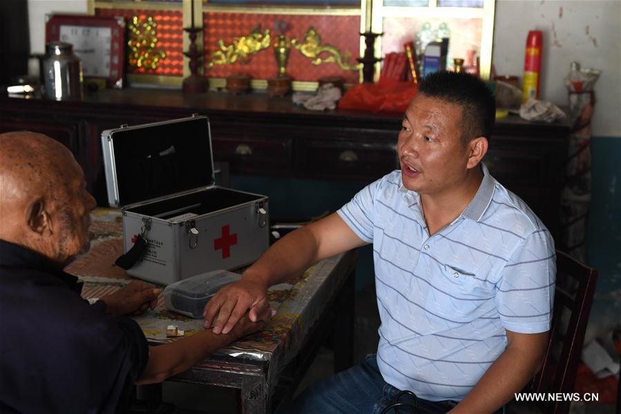 El doctor Yu Jiajun examina a un paciente en la aldea Haidao, una “isla” monta?osa de la Reserva Xianghongdian. 14 de septiembre del 2017. (Foto: Xinhua)