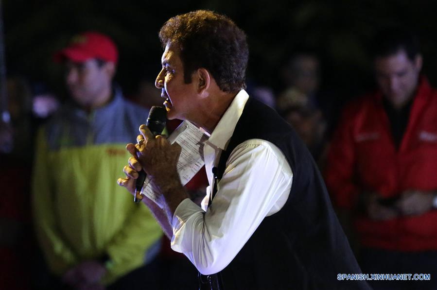 El candidato a la presidencia de Honduras por la Alianza de Oposición, Salvador Nasralla (frente), participa durante su acto de cierre de camapa?a electoral, en Tegucigalpa, Honduras, el 20 de noviembre de 2017. Los candidatos presidenciales con mayor opción de triunfo en las elecciones generales del 26 de noviembre en Honduras, realizan el lunes masivos cierres de campa?a en la recta final de los comicios, con numerosas concentraciones en diversas ciudades del país. (Xinhua/Rafael Ochoa)