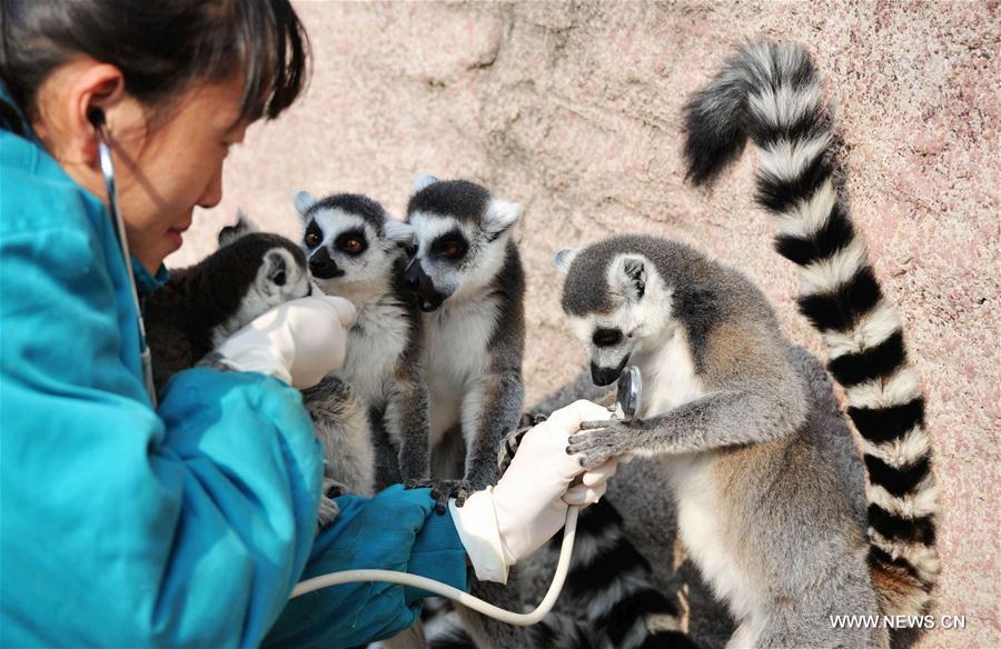 Un veterinario examina los lémures de cola anillada la Reserva de Vida Salvaje de Qingdao, provincia de Shandong. A los tigres siberianos, hipopótamos y otras especies se les practicó el chequeo de salud de invierno, 21 de noviembre del 2017. (Foto: Yu Fangping)