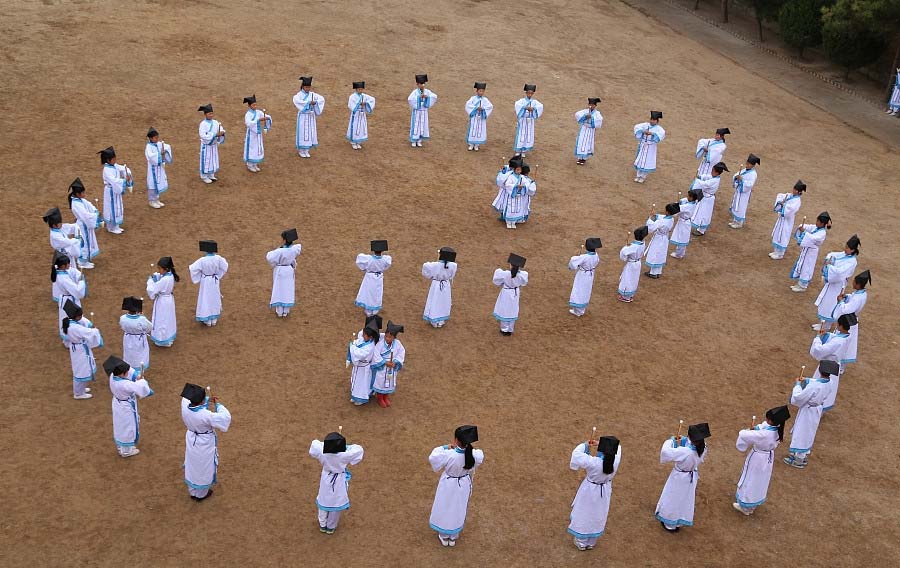 Beijing,23/11/2017(El Pueblo en Línea)-Cada vez hace más frío. Para energizarse, los estudiantes de diversas provincias chinas realizan diversos ejercicios físicos.La variedad va más allá lo imaginado.Estudiantes de primariaataviados contrajes tradicionales Han realizan artes marciales y caligrafía en Pingliang, provincia de Gansu, 25 de abril del 2016. [Foto: VCG]