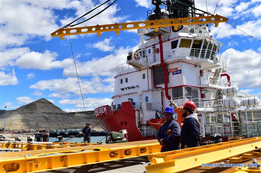 CHUBUT, noviembre 22, 2017 (Xinhua) -- Empleados realizan preparativos por parte de la Armada de Estados Unidos para colaborar con la búsqueda del submarino ARA San Juan, en el muelle marítimo de Comodoro Rivadavia, provincia de Chubut, Argentina, el 22 de noviembre de 2017. El portavoz de la Armada de la República Argentina (ARA) en Buenos Aires, Enrique Balbi, confirmó la ma?ana del miércoles que "no hay rastros" del submarino desaparecido el 15 de noviembre en el Atlántico sur con 44 tripulantes a bordo. El funcionario militar brindó un nuevo parte oficial en la sede de la ARA, en el barrio de Retiro en la zona norte de la capital argentina, donde descartó versiones que indicaban haber detectado "imágenes térmicas" en la zona de búsqueda. En tanto que, amigos y familiares de los 44 tripulantes del submarino argentino ARA San Juan, realizaron una misa en la Base Naval de la ciudad de Mar del Plata, para pedir por el regreso a casa de los marinos. La ceremonia religiosa, que tuvo lugar en la capilla "Stella Maris" de la Base Naval, fue organizada por amigos, familiares y compa?eros de la escuela del capitán de corbeta, Jorge Bergallo, uno de los 44 tripulantes del navío. (Xinhua/Maxi Jonas/TELAM)