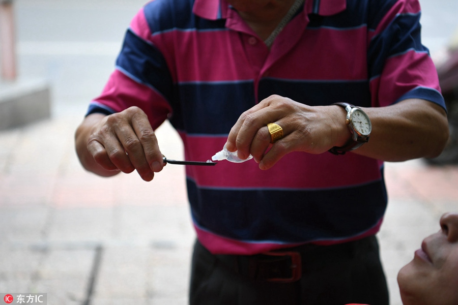 Xiong aplica un colirio de una botella que cuesta unos 10 yuanes sobre la navaja después de esterilizarla, el 24 de agosto de 2017. [Foto / IC] [Foto / IC]