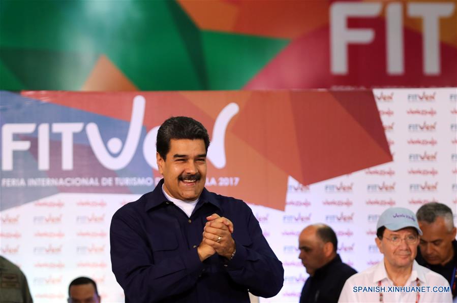 CARACAS, noviembre 26, 2017 (Xinhua) -- Imagen cedida por la Presidencia de Venezuela del presidente venezolano, Nicolás Maduro (c), participando en el acto de clausura de la Feria Internacional de Turismo en Venezuela (FITVEN), realizado en Nueva Esparta, Venezuela, el 26 de noviembre de 2107. El ministro venezolano de Comunicación e Información, Jorge Rodríguez, afirmó el domingo que están preparados para participar en la mesa de diálogo con la oposición en República Dominicana los días 1 y 2 de diciembre. El también vocero principal del gobierno en las conversaciones mencionó la agenda con la oposición durante el programa "Los domingo con Maduro", transmitido por el canal estatal Venezolana de Televisión. (Xinhua/Prensa Presidencial)