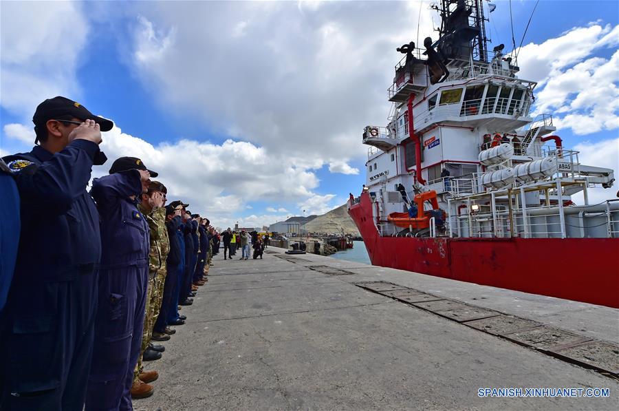 Residentes despiden al buque "Sophie Siem" durante su partida del puerto de Comodoro Rivadavia, en Argentina, el 26 de noviembre de 2017. El portavoz de la Armada de la República Argentina (ARA) en Buenos Aires, Enrique Balbi, afirmó el domingo que la fuerza mantiene una búsqueda "ininterrumpida" del submarino ARA San Juan, desaparecido el 15 de noviembre en el Atlántico sur con 44 tripulantes a bordo. El buque noruego "Sophie Siem" zarpó el domingo desde el puerto de la ciudad de Comodoro Rivadavia en el sur del país, navío que transporta un minisubmarino estadounidense para buscar al sumergible argentino perdido. (Xinhua/Maxi Jonas/TELAM)