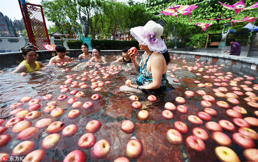 Una mujer prueba una manzana que flota en un manantial de agua caliente en Luoyang, provincia de Henan, el 28 de abril de 2016. [Foto / IC]