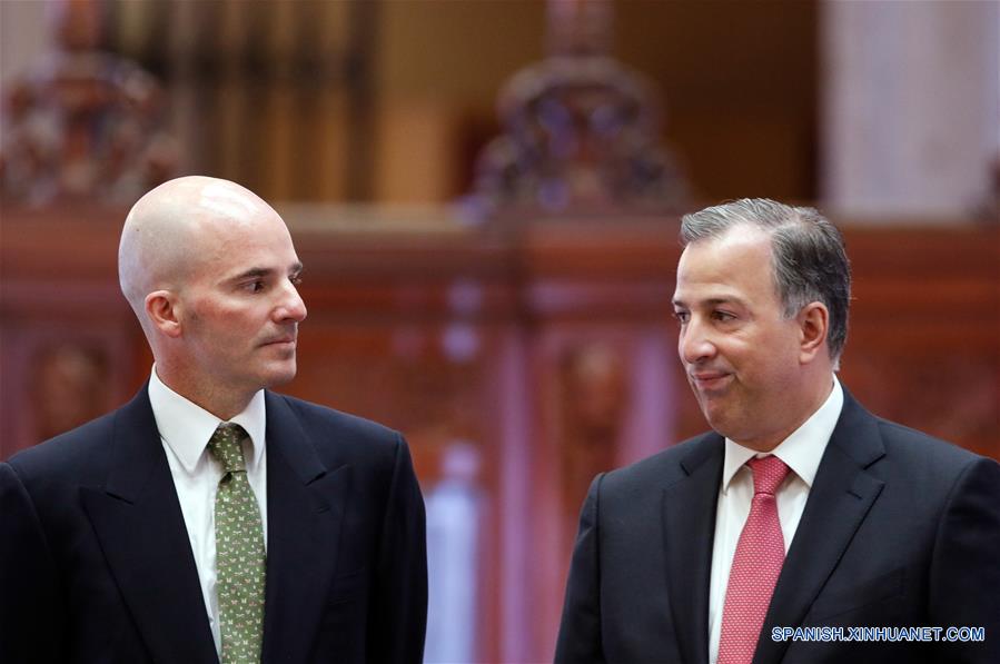 El ex secretario mexicano de Hacienda, José Antonio Meade (d), y el nuevo secretario de Hacienda, José Antonio González Anaya (i), reaccionan luego del anuncio de la renuncia de Meade, en la Ciudad de México, capital de México, el 27 de noviembre de 2017. Tras renunciar como secretario de Hacienda de México, José Antonio Meade anunció el lunes su intención de buscar la candidatura presidencial por el partido oficialista para la elecciones de 2018. "Me despido de esta secretaría con el orgullo de pertenecer a este equipo. Solicitaré mi registro como precandidato a la Presidencia de la República por el Partido Revolucionario Institucional (PRI)", se?aló. El anuncio lo hizo en las oficinas del ministerio de Hacienda, donde hasta la ma?ana del lunes despachó, acompa?ado por su relevo, José Antonio González, luego de que presentó su renuncia al presidente mexicano, Enrique Pe?a Nieto. (Xinhua/Francisco Ca?edo)