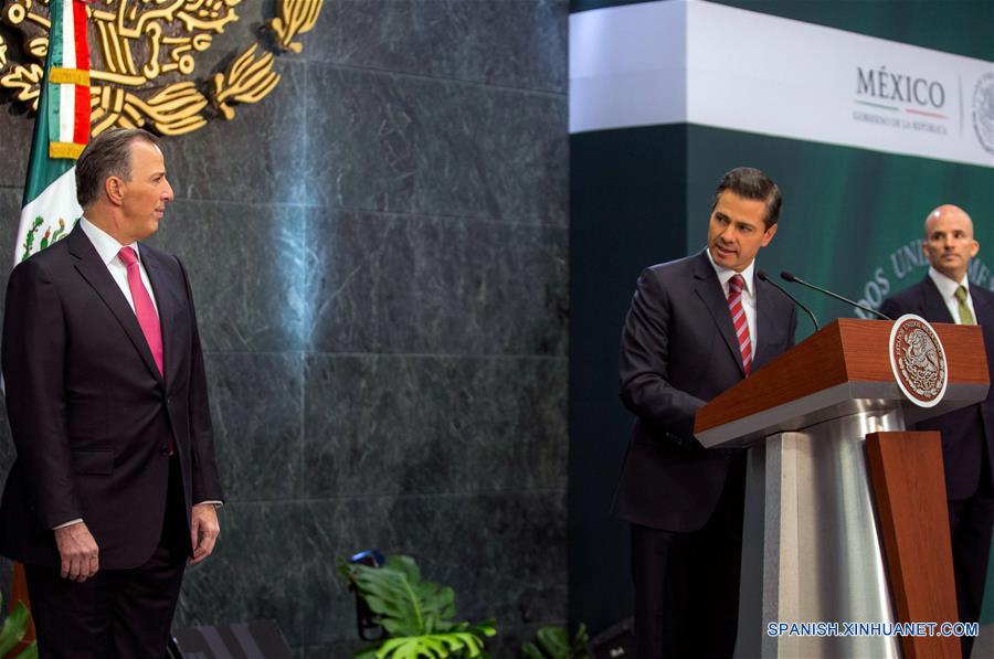 Imagen cedida por la Presidencia de México, del presidente mexicano Enrique Pe?a Nieto (c), acompa?ado por el exsecretario mexicano de Hacienda, José Antonio Meade (i) y su sucesor, José Antonio Gonzalez Anaya (d), ofreciendo un mensaje a medios de comunicación en el que anunció cambios en su Gabinete, en la Ciudad de México, capital de México, el 27 de noviembre de 2017. El presidente de México, Enrique Pe?a Nieto, nombró el lunes a José Antonio González Anaya como nuevo secretario de Hacienda, tras la renuncia de José Antonio Meade. Tras renunciar como secretario de Hacienda de México, José Antonio Meade anunció el lunes su intención de buscar la candidatura presidencial por el partido oficialista para la elecciones de 2018. (Xinhua/Presidencia de México)