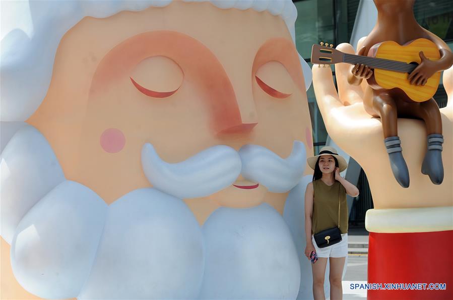 Una mujer posa frente a las decoraciones de Navidad instaladas cerca de un centro comercial, en Bangkok, Tailandia, el 28 de noviembre de 2017. (Xinhua/Rachen Sageamsak)