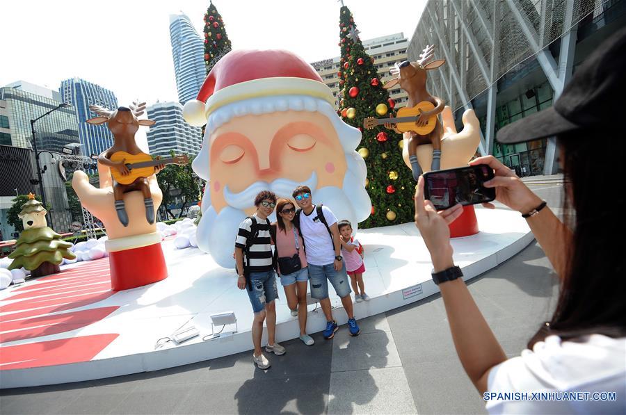 BANGKOK, noviembre 28, 2017 (Xinhua) -- Turistas posan frente a las decoraciones de Navidad instaladas cerca de un centro comercial, en Bangkok, Tailandia, el 28 de noviembre de 2017. (Xinhua/Rachen Sageamsak)