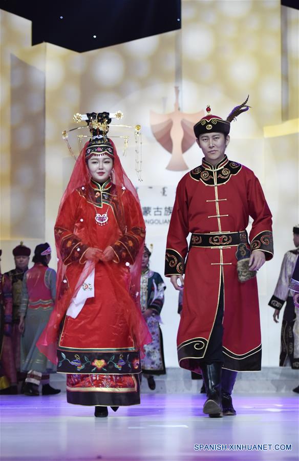 Modelos presentan trajes tradicionales durante la Competencia de Trajes Mongoles en Hohhot, capital de la Región Autónoma de Mongolia Interior, en el norte de China, el 27 de noviembre de 2017. (Xinhua/Wang Zheng)