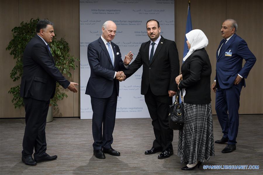 GINEBRA, noviembre 28, 2017 (Xinhua) -- El enviado especial de la Organización de las Naciones Unidas (ONU) para Siria, Staffan de Mistura (2-i), estrecha la mano con el líder de la Comisión de Negociación Siria (CNS), Nasr al-Hariri (3-d), durante su reunión en el Palacio de las Naciones en Ginebra, Suiza, el 28 de noviembre de 2017. El enviado especial de la ONU para Siria, Staffan de Mistura, entabló la tarde del martes conversaciones bilaterales con la delegación opositora siria, con lo que inició la nueva ronda de conversaciones entre las partes sirias bajo auspicios de la ONU. (Xinhua/Pool/Fabrice COFFRINI)