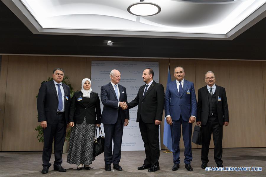 GINEBRA, noviembre 28, 2017 (Xinhua) -- El enviado especial de la Organización de las Naciones Unidas (ONU) para Siria, Staffan de Mistura (3-i), estrecha la mano con el líder de la Comisión de Negociación Siria (CNS), Nasr al-Hariri (3-d), durante su reunión en el Palacio de las Naciones en Ginebra, Suiza, el 28 de noviembre de 2017. El enviado especial de la ONU para Siria, Staffan de Mistura, entabló la tarde del martes conversaciones bilaterales con la delegación opositora siria, con lo que inició la nueva ronda de conversaciones entre las partes sirias bajo auspicios de la ONU. (Xinhua/Pool/Fabrice COFFRINI)