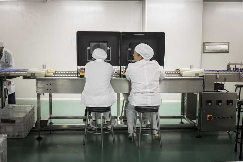 Empleados inspeccionan medicamentos en la línea de producción de la planta Baiyunshan de Guangzhou Pharmaceutical Holdings en Guangzhou.