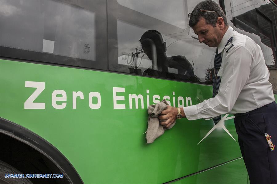 Imagen del 27 de noviembre de 2017, de Daniel Ríos, conductor del primer ómnibus eléctrico en Cuba de la compa?ía china Yutong, limpiando el vehículo en La Habana, Cuba. (Xinhua/Str)