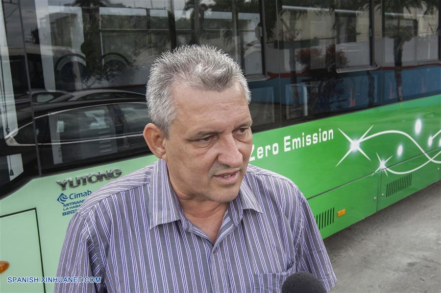Imagen del 27 de noviembre de 2017, de Jorge Luis León, director técnico de la empresa de transporte de La Habana, participando en una entrevista con la Agencia de Noticias Xinhua sobre el primer ómnibus eléctrico en Cuba de la compa?ía china Yutong, en La Habana, Cuba. (Xinhua/Str)