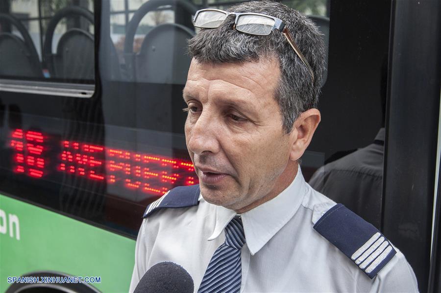 Imagen del 27 de noviembre de 2017, de Daniel Ríos, conductor del primer ómnibus eléctrico en Cuba de la compa?ía china Yutong, participando en una entrevista con la Agencia de Noticias Xinhua, en La Habana, Cuba. (Xinhua/Str)