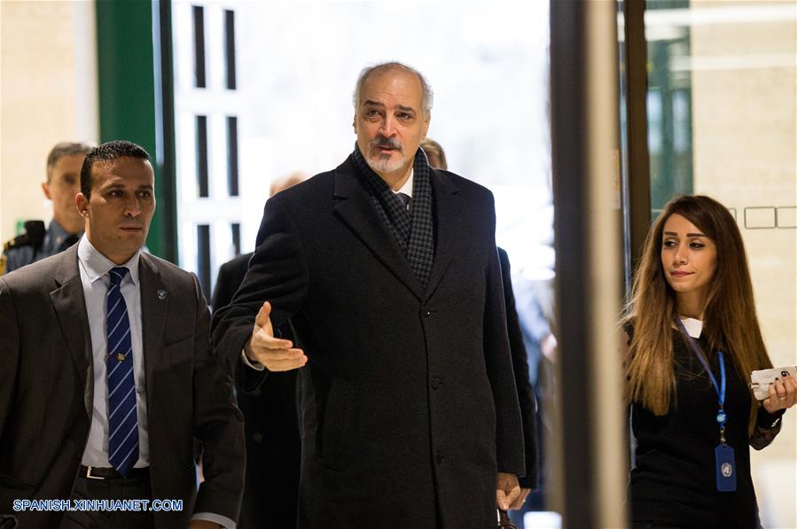 El embajador de Siria ante la Organización de las Naciones Unidas (ONU) y jefe de la delegación del gobierno, Bashar al-Jaafari (c), llega para asistir a una nueva ronda de negociaciones, durante las conversaciones Intra Sirias encabezadas por la ONU, en Ginebra, Suiza, el 30 de noviembre de 2017. El enviado especial de la ONU para Siria, Staffan de Mistura, realizó el jueves reuniones separadas con la delegación del gobierno sirio y las delegaciones de la Comisión de Negociación de Siria (CNS) al mismo tiempo. (Xinhua/POOL/Xu Jinquan)