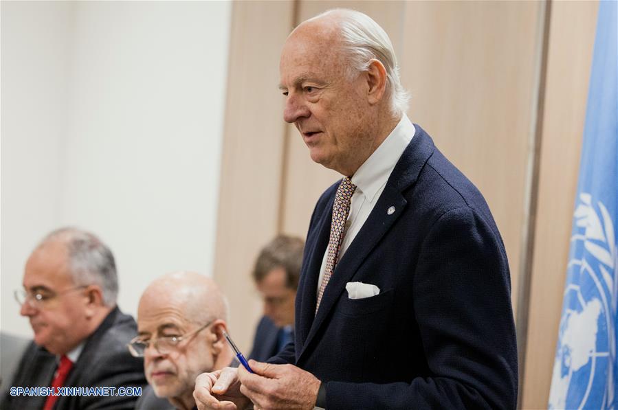 El enviado especial de la Organización de las Naciones Unidas (ONU) para Siria, Staffan de Mistura, participa durante una reunión con la delegación del gobierno sirio, durante las conversaciones Intra Sirias encabezadas por la ONU, en Ginebra, Suiza, el 30 de noviembre de 2017. El enviado especial de la ONU para Siria, Staffan de Mistura, realizó el jueves reuniones separadas con la delegación del gobierno sirio y las delegaciones de la Comisión de Negociación de Siria (CNS) al mismo tiempo. (Xinhua/POOL/Xu Jinquan)