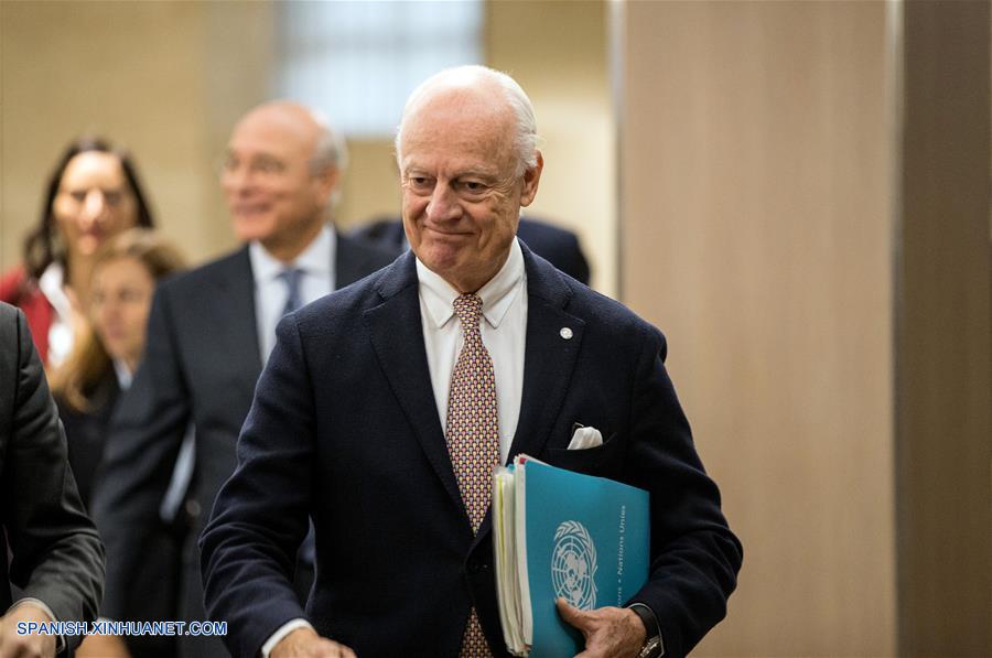 El enviado especial de la Organización de las Naciones Unidas (ONU) para Siria, Staffan de Mistura (frente), llega para asistir a una nueva ronda de negociaciones, durante las conversaciones Intra Sirias encabezadas por la ONU, en Ginebra, Suiza, el 30 de noviembre de 2017. El enviado especial de la ONU para Siria, Staffan de Mistura, realizó el jueves reuniones separadas con la delegación del gobierno sirio y las delegaciones de la Comisión de Negociación de Siria (CNS) al mismo tiempo. (Xinhua/POOL/Xu Jinquan)