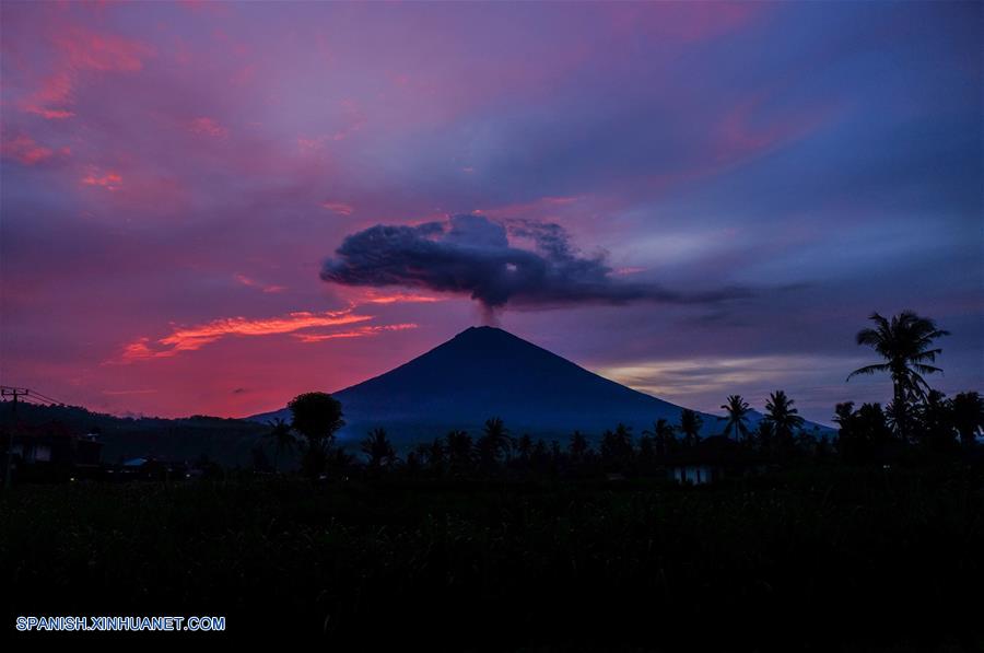 El Monte Agung expulsa ceniza volcánica, en la villa de Amed, distrito de Karangasem, Bali, Indonesia, el 30 de noviembre de 2017. (Xinhua/Veri Sanovri)