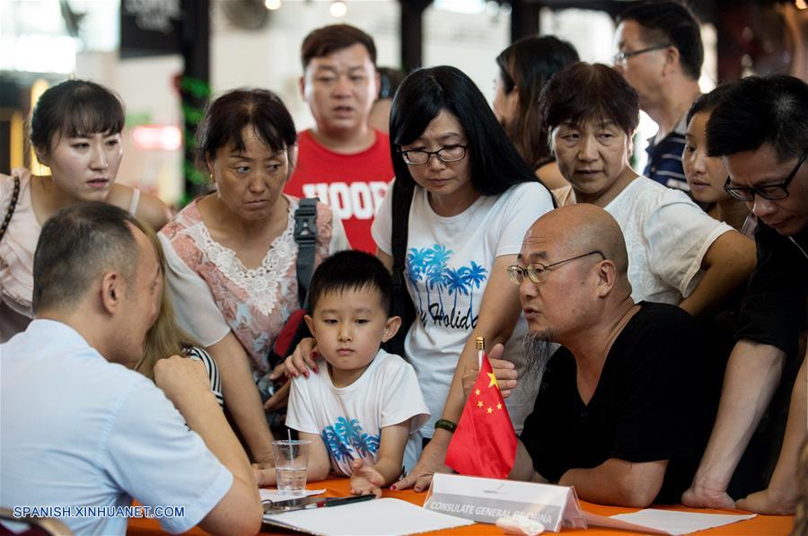 Turistas chinos dialogan con empleados del consulado de China en Denpasar de Indonesia, mientras esperan en el Aeropuerto Internacional Ngurah Rai, en Bali, Indonesia, el 30 de noviembre de 2017. (Xinhua/Du Yu)