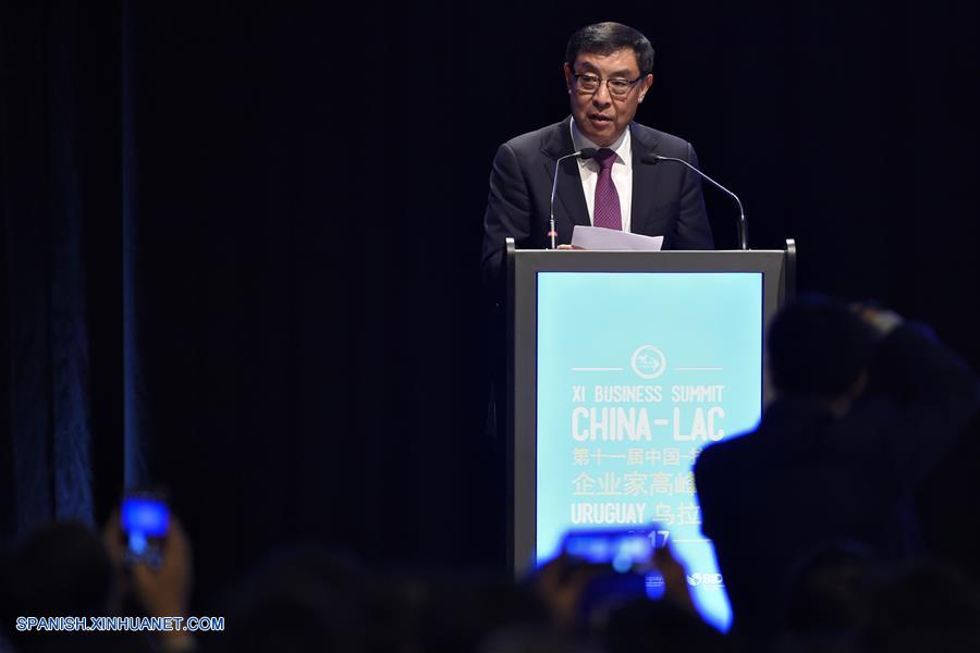 PUNTA DEL ESTE, diciembre 1, 2017 (Xinhua) -- El vicepresidente de la Conferencia Consultiva Política del Pueblo Chino, Ma Peihua, pronuncia su discurso durante la apertura de la XI Cumbre Empresarial China-LAC (Latinoamérica y Caribe) 2017, en el Centro de Convenciones de Punta del Este, Uruguay, el 1 de diciembre de 2017. El presidente de Uruguay, Tabaré Vázquez, afirmó el viernes en la apertura de la XI Cumbre Empresarial China-LAC (Latinoamérica y Caribe) 2017 en Punta del Este, que su país aspira a la firma en 2018 de un acuerdo de cooperación en varias áreas entre la CELAC y China. Vázquez se?aló que esta Cumbre que se desarrollará hasta el sábado en el balneario de Punta del Este, es una instancia preparatoria de la reunión ministerial de la Comunidad de Estados Latinoamericanos y Caribe?os (CELAC) y China de enero próximo en Santiago, Chile. En la apertura oficial de la XI Cumbre Empresarial China-LAC en el Centro de Convenciones de Punta del Este también participaron, además del presidente Vázquez, el vicepresidente de la Conferencia Consultiva Política del Pueblo Chino, Ma Peihua; y el vicepresidente del Consejo Chino para el Fomento del Comercio Internacional, Chen Zhou. (Xinhua/Nicolás Celaya)