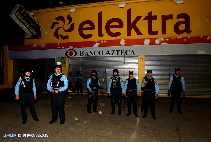 Policías vigilan frente a una tienda, en el marco del toque de queda tras las elecciones presidenciales, en Tegucigalpa, Honduras, durante las últimas horas del 2 de diciembre de 2017. (Xinhua/Johny Magallanes)