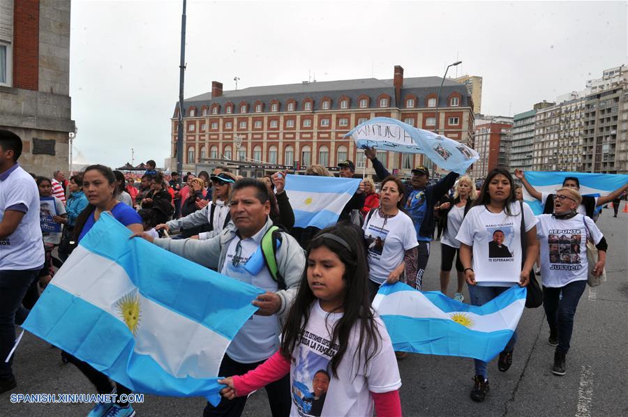 Familiares de miembros de la tripulación del submarino ARA San Juan marchan para exigir la presencia del presidente argentino, Mauricio Macri, en la Base Naval de Mar del Plata, en la ciudad de Mar del Plata, Argentina, el 3 de diciembre de 2017. (Xinhua/Alejandro Moritz/TELAM)