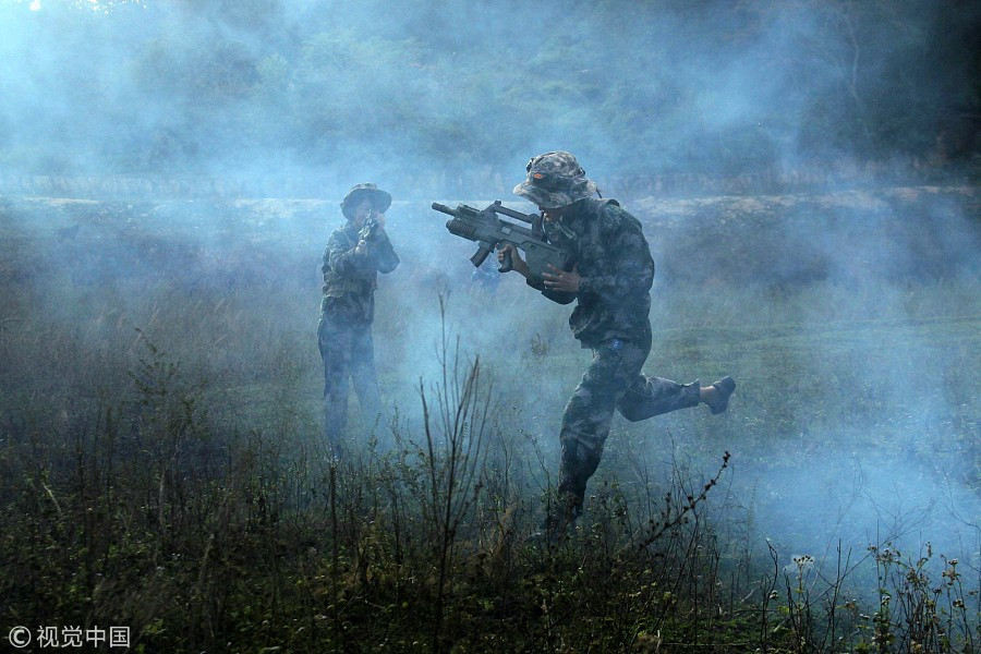 Estudiantes simulan combates dentro de un curso opcional de capacitación de supervivencia en Quanzhou, provincia de Fujian que incluyen a sobrevivir en el agua, simular combates, recolectar hortalizas, comer pescado crudo y acampar al aire libre, 2 de diciembre del 2017. [Foto: VCG]