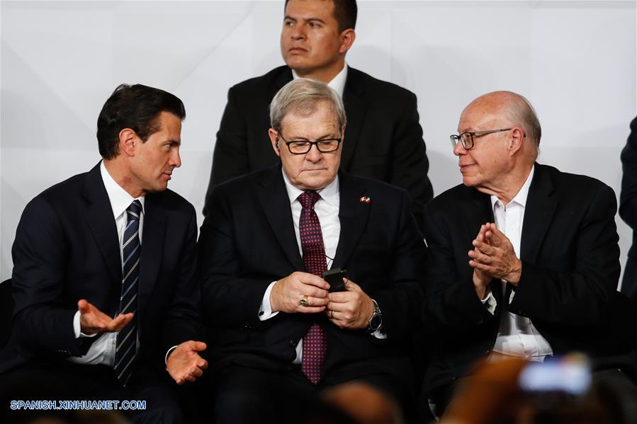 El presidente mexicano, Enrique Pe?a Nieto (d), el ministro de Agricultura y Agroalimentos de Canadá, Lawrence MacAulay (c) y el secretario de Salud mexicano, José Narro (i), participan durante la ceremonia de inauguración de la Expo México Alimentaria 2017 Food Show, en la Ciudad de México, capital de México, el 7 de diciembre de 2017. (Xinhua/Francisco Ca?edo)