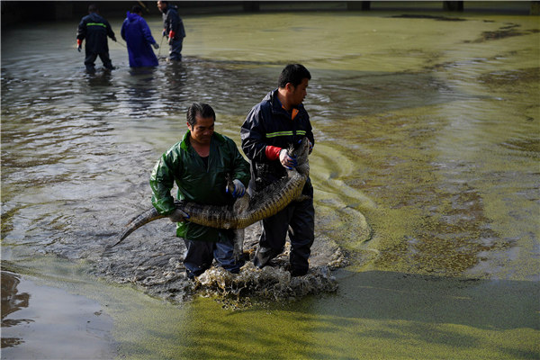 Criadoresde la Reserva Natural Nacional del Caimán Chinotrasladan a un cocodrilo adulto hacia una piscina de alimentación. [Foto: Wu Fang]