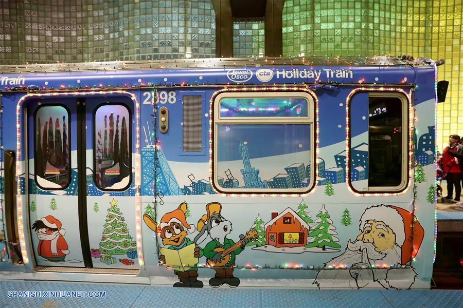 Vista del Tren de Navidad en la estación O'Hare, en Chicago, Estados Unidos, el 9 de diciembre de 2017. Para celebrar la temporada de Navidad, la Autoridad de Tránsito de Chicago puso en funcionamiento el servicio del Tren de Navidad. (Xinhua/Wang Ping)