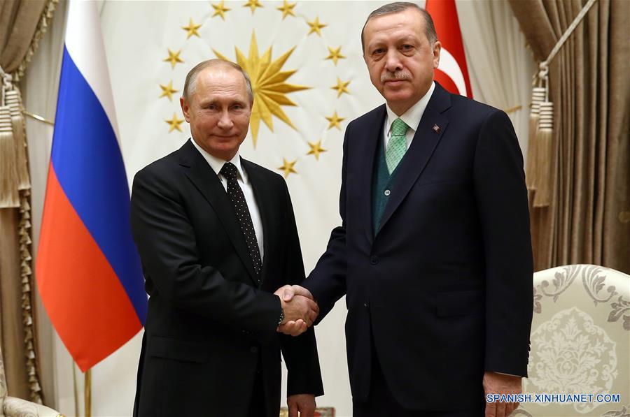 Imagen cedida por el Palacio Presidencial de Turquía, del presidente turco, Recep Tayyip Erdogan (d), estrechando la mano con su homólogo de Rusia, Vladimir Putin, durante su reunión en Ankara, Turquía, el 11 de diciembre de 2017. De acuerdo con información de la prensa local, Erdogan y Putin advirtieron el lunes que el movimiento de Estados Unidos en Jerusalén desestabiliza a Medio Oriente y no ayudará a resolver el conflicto israelí-palestino. (Xinhua/Palacio Presidencial de Turquía)