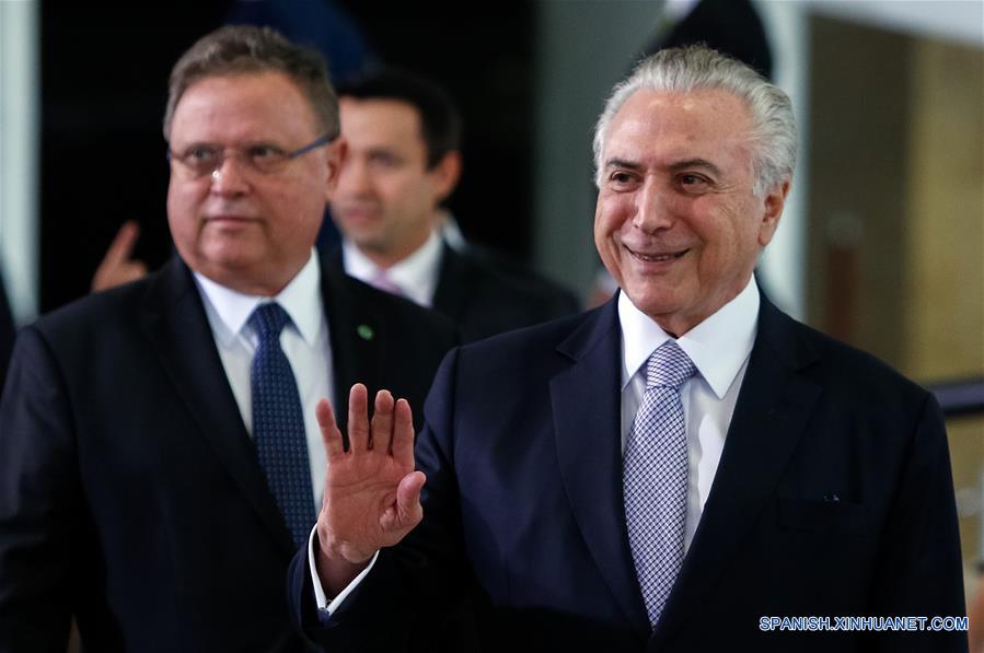 Imagen cedida por la Presidencia de Brasil, del presidente brasile?o, Michel Temer (d), acompa?ado por el ministro de Agricultura de Brasil, Blairo Maggi (i-frente), participando durante un acto de la Confederación Nacional de Agricultura (CNA), en el Palacio de Planalto en Brasilia, Brasil, el 12 de diciembre de 2017. El presidente de Brasil, Michel Temer, afirmó el martes que el país vive un "momento reformista", citando la reforma de la Seguridad Social y la necesidad de aprobarla cuanto antes. La declaración fue realizada en un acto en la Confederación Nacional de Agricultura (CNA), la entidad que reúne a los grandes productores rurales del país. (Xinhua/Alan Santos/Presidencia de Brasil)