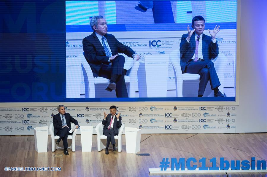 El fundador y presidente ejecutivo del Alibaba Group, Jack Ma (d), participa junto a Richard Samans (i), jefe de la Sección de Comercio Global y miembro de la Junta Ejecutiva del Foro Económico Mundial (WEF, por sus siglas en inglés), durante el Foro Empresarial MC11 en el marco de la XI Conferencia Ministerial (11CM) de la Organización Mundial del Comercio (OMC), en Buenos Aires. Argentina, el 12 de diciembre de 2017.(Xinhua/Martín Zabala)