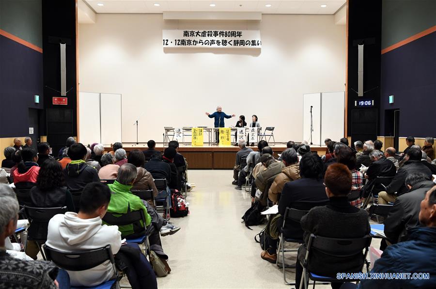 Japoneses asisten a una reunión testimonial llevada a cabo en la ciudad de Shizuoka, en el centro de Japón, el 12 de diciembre de 2107. Cerca de 200 japoneses asistieron el martes a una reunión testimonial en la ciudad de Shizuoka, en el centro de Japón, para conmemorar la Masacre de Nanjing de 1937. (Xinhua/Ma Ping)
