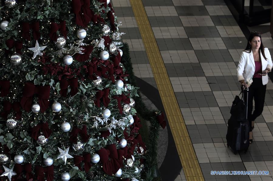 Una pasajera camina cerca de un árbol de Navidad, en el Aeropuerto de Congonhas en Sao Paulo, Brasil, el 13 de diciembre de 2017. (Xinhua/Rahel Patrasso)