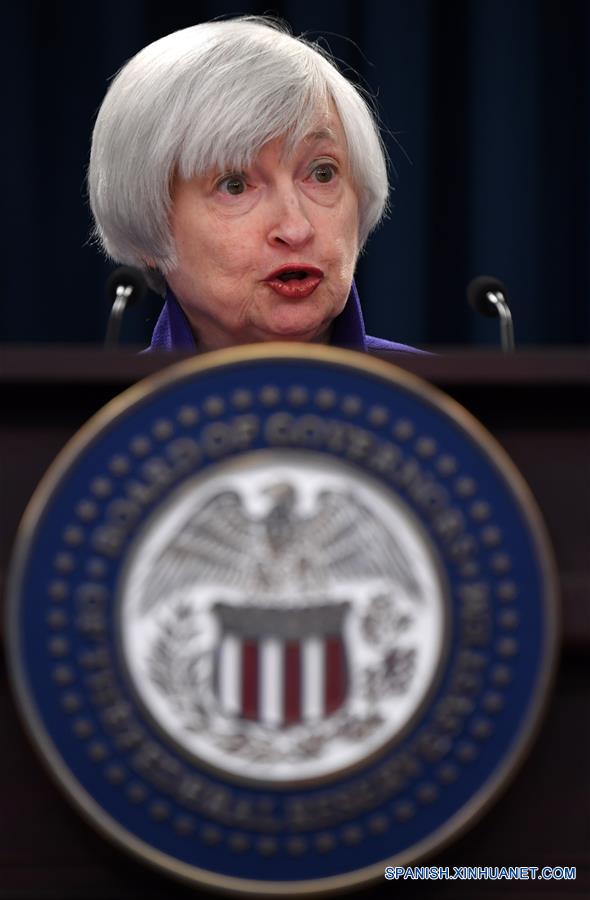 La presidenta de la Reserva Federal (Fed) de Estados Unidos, Janet Yellen, participa en una conferencia de prensa en Washington D.C., Estados Unidos, el 13 de diciembre de 2017. La Reserva Federal de Estados Unidos (Fed) elevó el miércoles las tasas de interés de referencia en 25 puntos base, el tercer incremento de 2017. (Xinhua/Yin Bogu)