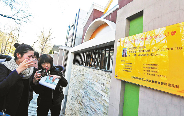 Las personas hacen fotos del panel de información de una inspectorade centros educativos fuera de una guardería en Beijing a principios de este mes. [Foto de YUAN YI / PARA CHINA DAILY]