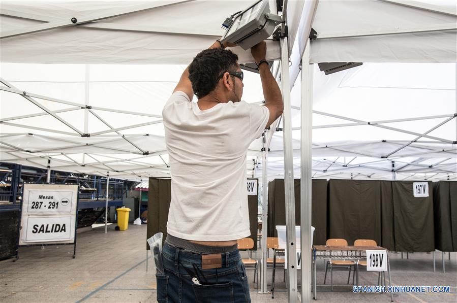 Un empleado trabaja en la instalación de las urnas en un centro de votación la víspera de las elecciones presidenciales, en la comuna de Santiago, Chile, el 16 de diciembre de 2017. (Xinhua/Jorge Villegas)