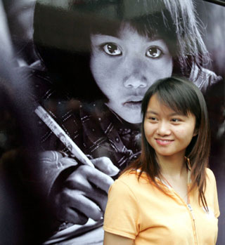 El 22 de mayo de 2005, Su Mingjuan posó en Beijing junto a su fotografía, que fue utilizada por Project Hope para ayudar a obtener apoyo para los estudiantes pobres que corren el riesgo de abandonar los estudios por falta de recursos. [Foto / Xinhua]