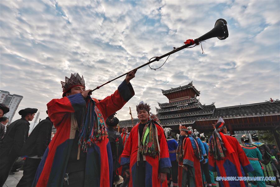 Personas del grupo étnico Dong participan durante el Festival Sama en la aldea Sanbao Dong, en el condado Rongjiang, en la provincia Guizhou, en el suroeste de China, el 18 de diciembre de 2017. Sama era el nombre de una heroína en la antigua sociedad materna de Dong. El festival, alistado como uno de los patrimonios culturales inmateriales nacionales, se celebra para conmemorar a sus ancestros. (Xinhua/Yang Ying)