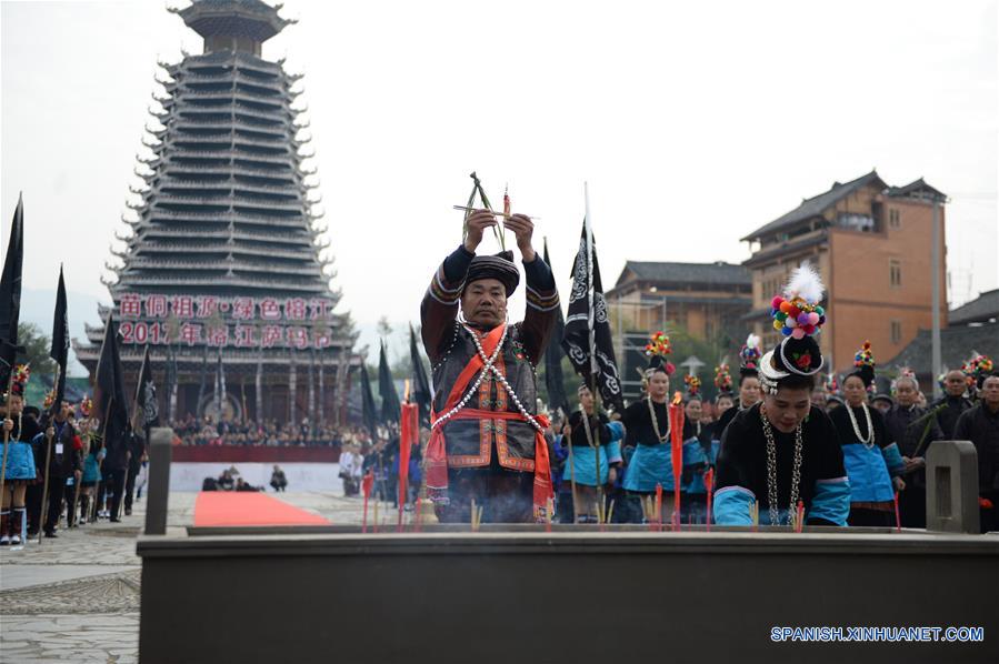 Personas del grupo étnico Dong participan durante el Festival Sama en la aldea Sanbao Dong, en el condado Rongjiang, en la provincia Guizhou, en el suroeste de China, el 18 de diciembre de 2017. Sama era el nombre de una heroína en la antigua sociedad materna de Dong. El festival, alistado como uno de los patrimonios culturales inmateriales nacionales, se celebra para conmemorar a sus ancestros. (Xinhua/Yang Ying)