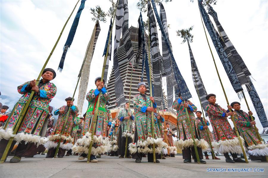 GUIZHOU, diciembre 18, 2017 (Xinhua) -- Personas del grupo étnico Dong participan durante el Festival Sama en la aldea Sanbao Dong, en el condado Rongjiang, en la provincia Guizhou, en el suroeste de China, el 18 de diciembre de 2017. Sama era el nombre de una heroína en la antigua sociedad materna de Dong. El festival, alistado como uno de los patrimonios culturales inmateriales nacionales, se celebra para conmemorar a sus ancestros. (Xinhua/Yang Ying)