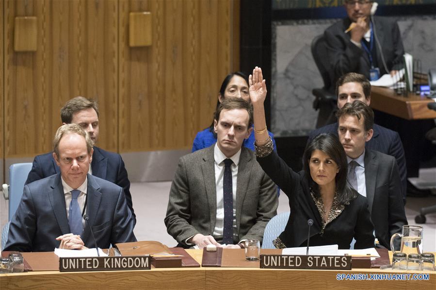La embajadora de Estados Unidos para la Organización de las Naciones Unidas (ONU), Nikki Haley (d-frente), veta un proyecto de resolución del Consejo de Seguridad de la ONU sobre el estatus de Jerusalén, en la sede de la ONU en Nueva York, Estados Unidos, el 18 de diciembre de 2017. Estados Unidos vetó el lunes un proyecto de resolución del Consejo de Seguridad de la ONU sobre el estatus de Jerusalén. A pesar del hecho de que los otros 14 miembros del Consejo de Seguridad votaron a favor del texto elaborado por Egipto, el proyecto de resolución fue rechazado por Estados Unidos, miembro permanente del Consejo de Seguridad con poder de veto. (Xinhua/UN Photo)