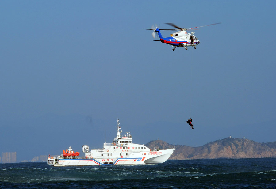 Un helicóptero sobrevuela un buque de rescate durante un ejercicio en Sanya, provincia de Hainan, el 19 de diciembre.[Foto / China Daily]