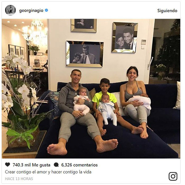 Con ropa informal y cómoda, el futbolista, Cristiano Ronaldo Jr. y Georgina aparecen sentados y cogiendo cada uno en sus brazos podemos ver a los peque?os de la casa: Eva, Mateo y Alana, que está arropada con una mantita rosa por lo que apenas podemos verla.