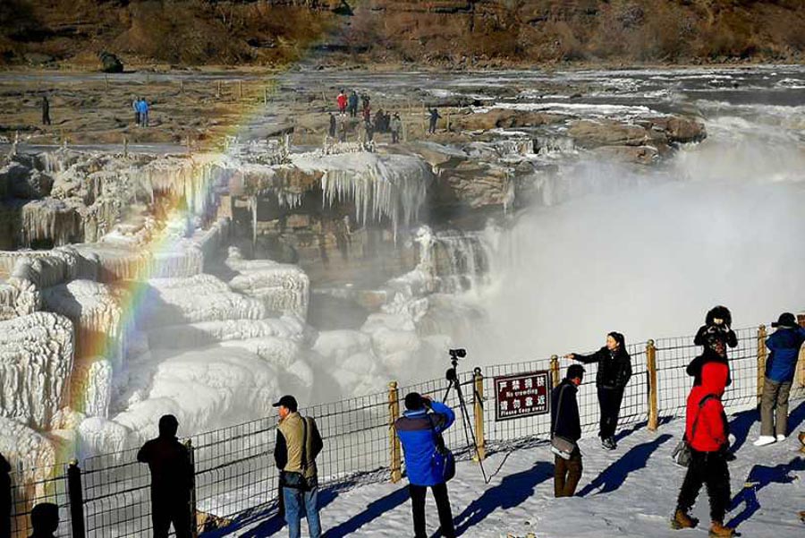 Un hermoso arcoiris se insinúa una y otra vez en su fervor colorido, para que los seres humanosno olviden nunca de revenciar la inefable belleza de la ignota Hukou. [Foto: Guiming y Rao Erbao]